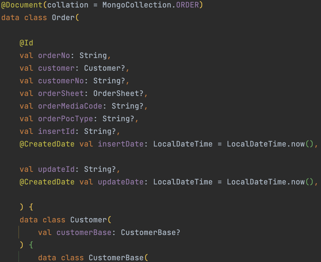 data class Order - @Document 자체를 생략해도.. data class name을 가지고 Document 유추가 가능하기에.. 좀 억지 같네요..ㅎㅎ