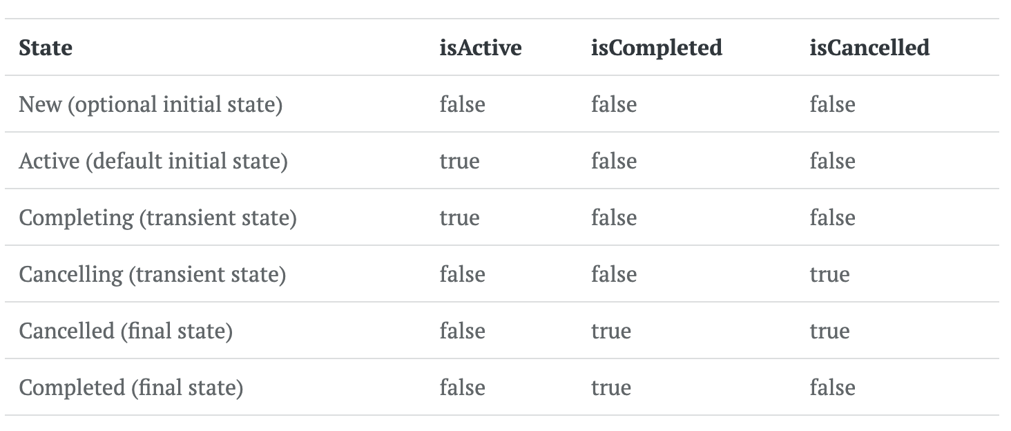 launch() 빌더는 코루틴을 시작하고, 코루틴을 실행 중인 작업의 상태를 추적하고 변경할 수 있는 Job 객체를 반환한다.