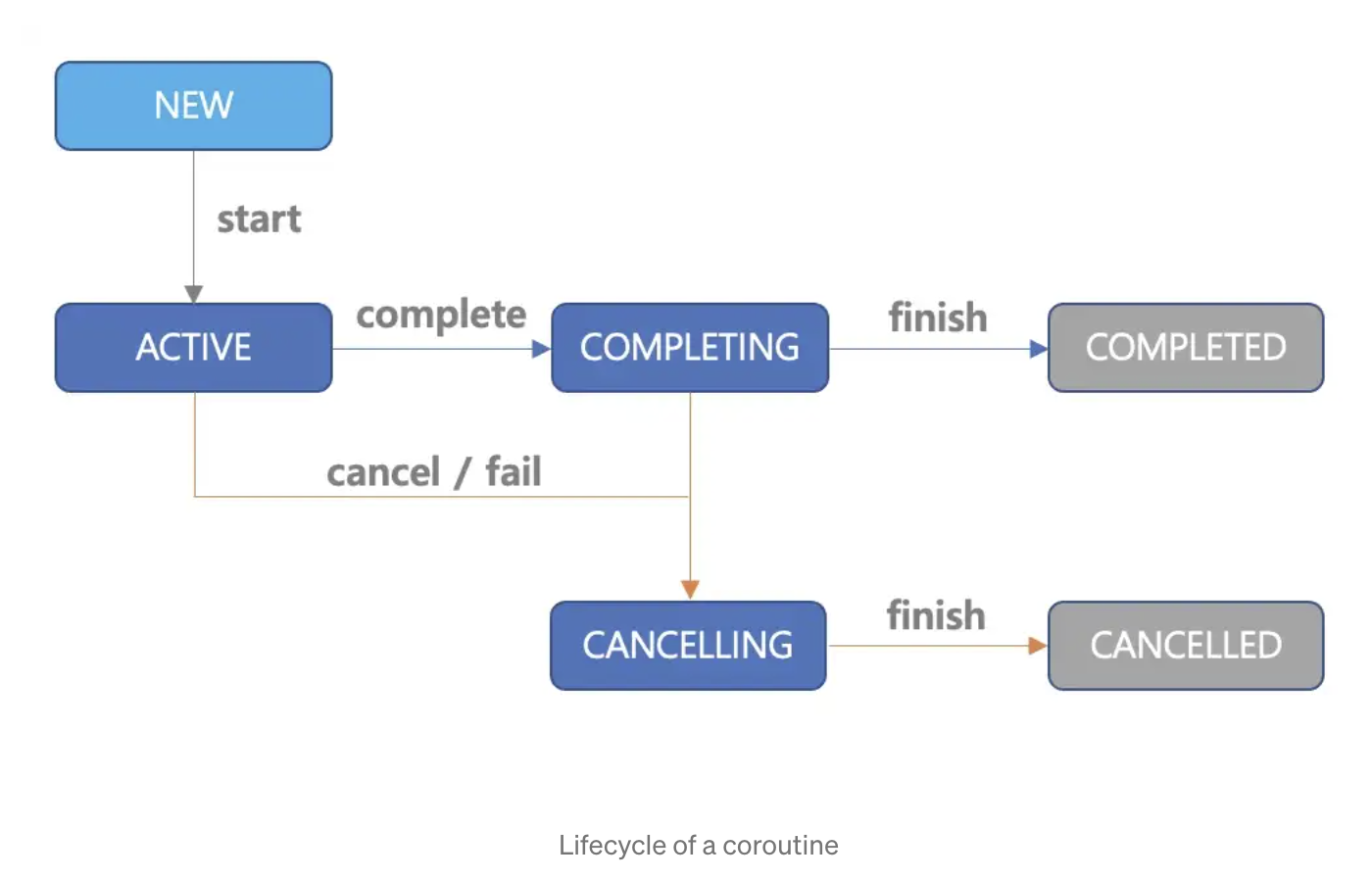 - async { } : Deffered 를 이용하여 single value를 return 하는 coroutine. Deferred value에. await()를 호출하여 최종 결과를 얻을 수 있다. Deferred는 Job이라, cancel 할 수도 있다.