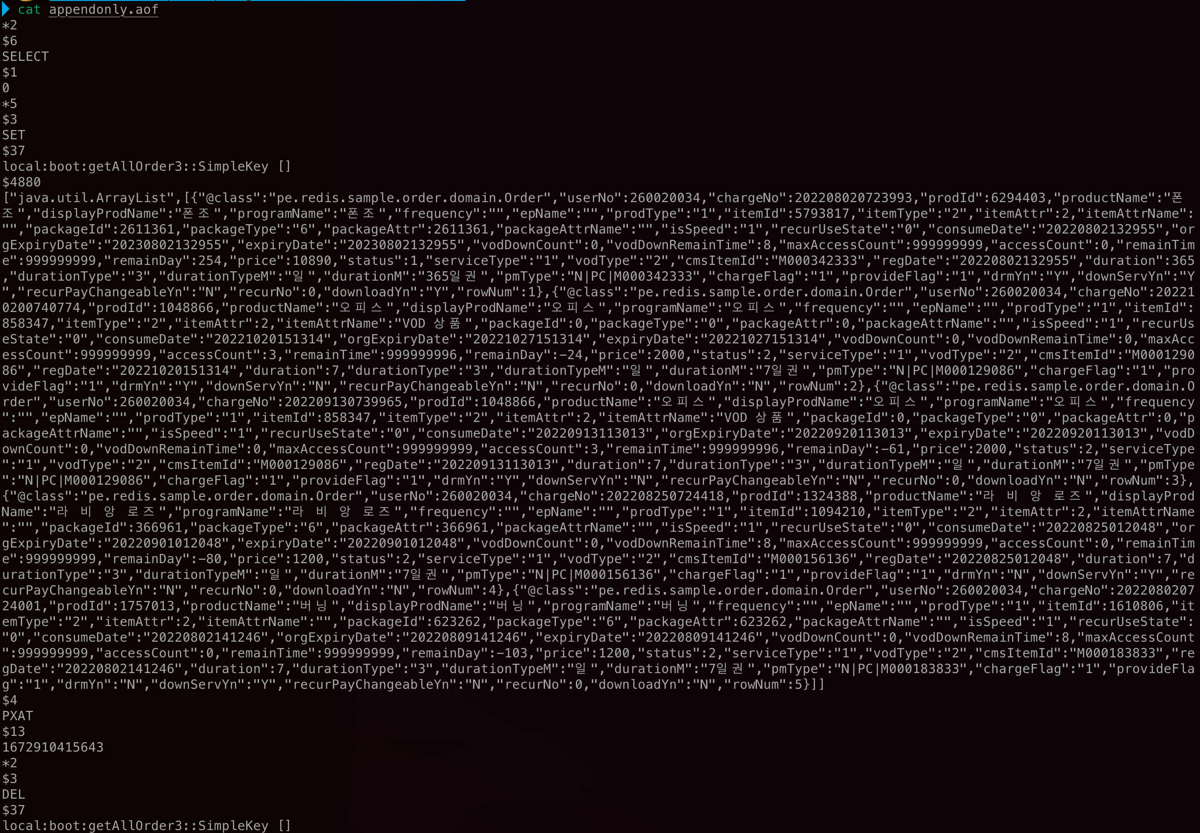 다시 cat 명령어로 appendonly file을 열어보면 위 내용에서 1672910415643 이후 라인이 삭제된 것을 볼 수 있습니다.