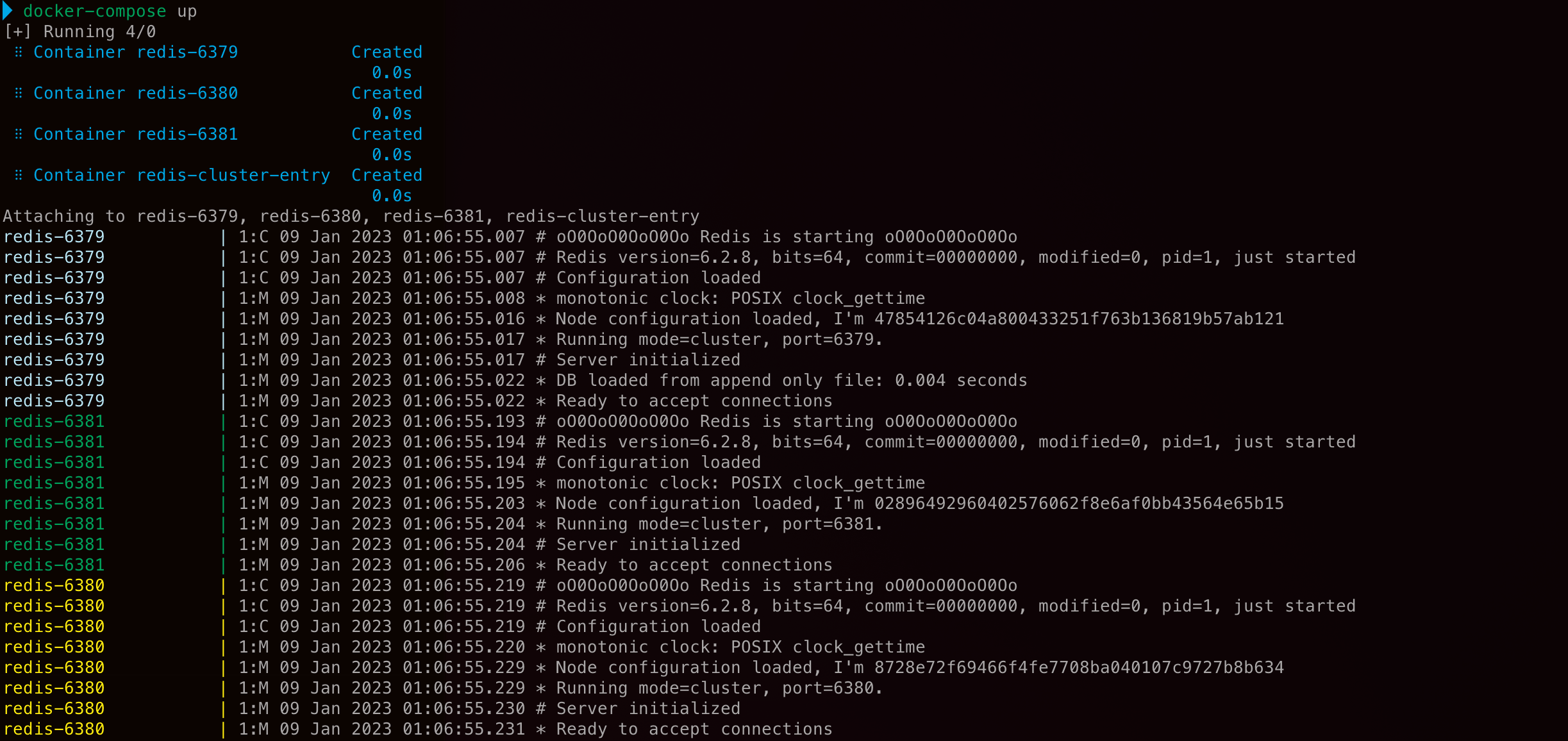 위 과정을 수행 후 docker-compose up을 수행하면 아래와 같이 정상적으로 Redis 컨테이너가 기동 됩니다.